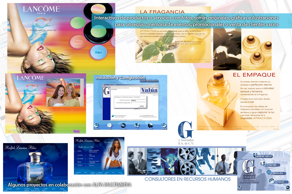 Websites, presentaciones interactivas de producto, discos interactivos, imagen corporativa, impresos, empaque y fotografía.